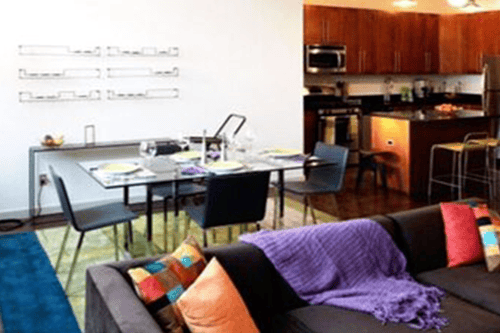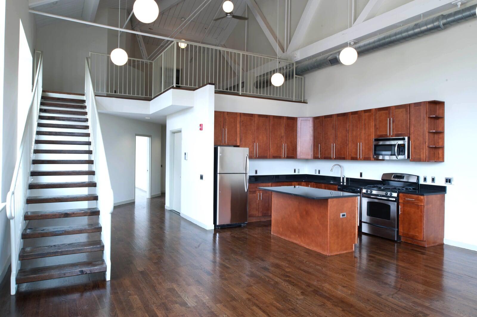 Once a Packard car showroom, this 1920s Art Deco building now houses 28 stylish apartments, offices, and two retail spaces. The residences feature loft-style interiors, exposed wood beam trusses, expansive windows, and energy-efficient amenities, blending vintage charm with contemporary comfort.